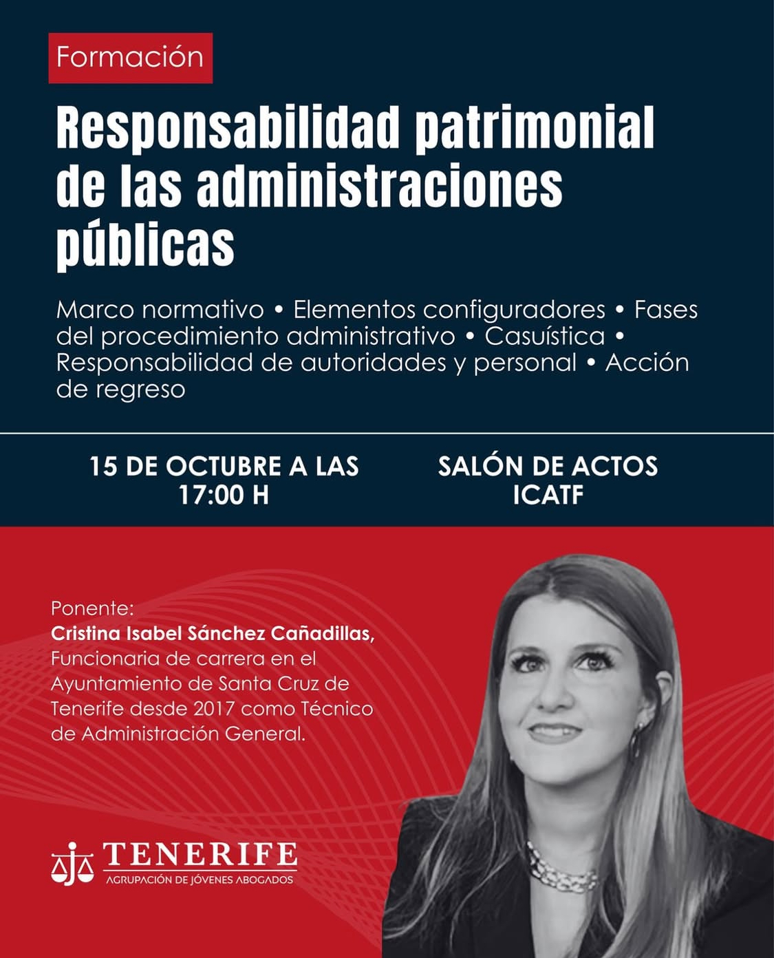 La Agrupación de Jóvenes Abogados del ICATF (AJA Tenerife) les invita a participar en su próxima jornada de formación “Responsabilidad patrimonial de las Administraciones Públicas”, que tendrá lugar el día 15 de octubre de 2025, de 17:00 a 19:00, en el salón de actos del ICATF, que será impartida por Dña. Cristina Isabel Sánchez Cañadillas, técnico de administración general del Excmo. Ayuntamiento de Santa Cruz de Tenerife.